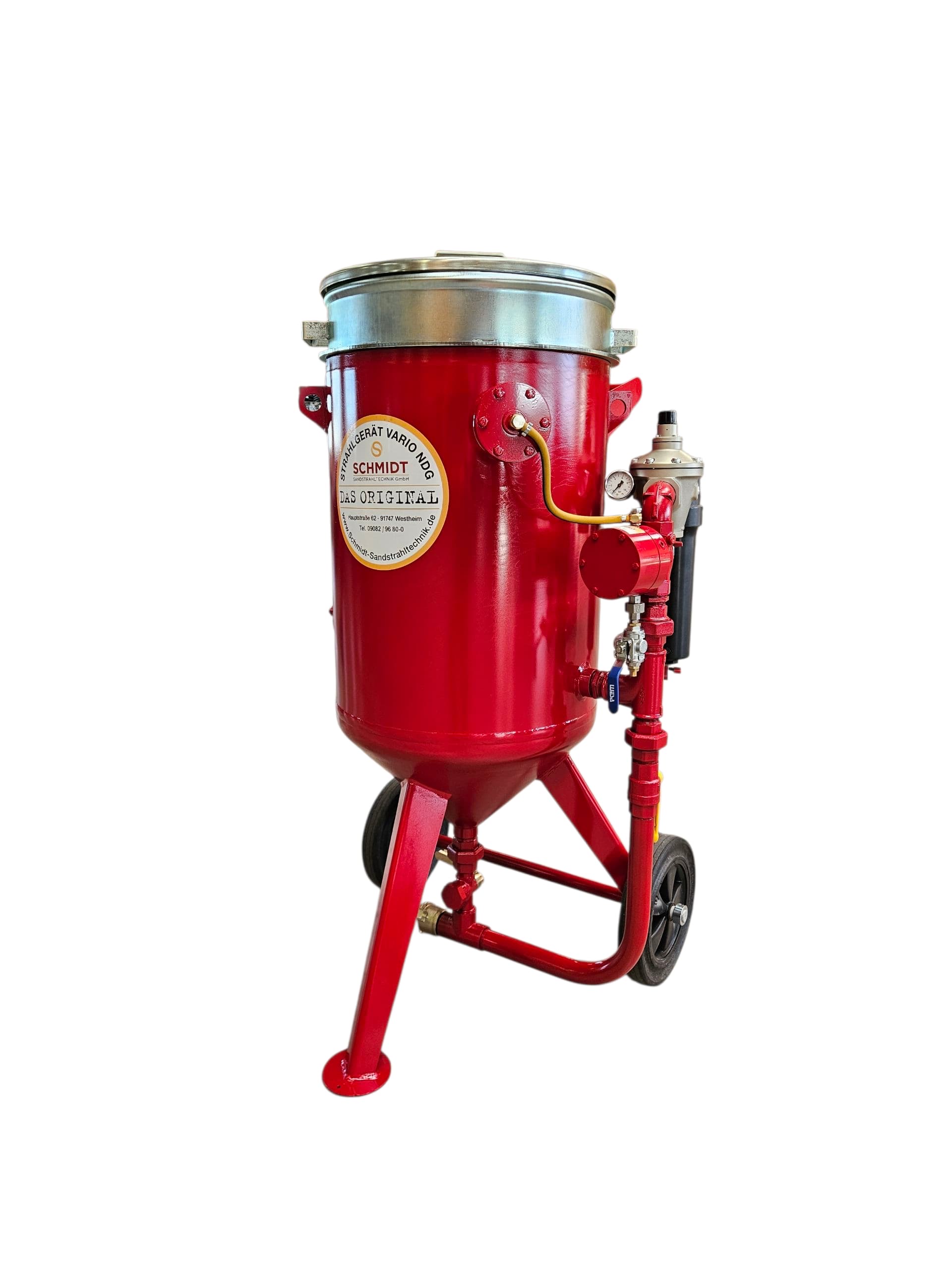 Strahlgeräte VARIO 60 bis 200 NDG (Niederdruckstrahlgeräte) mit pneumatischer oder elektropneumatischer Fernsteuerung, Wasserabscheider, Sieb, Deckel, Strahlschlauch 25 x 7 oder 32 x 8 mm, TPT-Strahlkopf, Wasserzerstäuber, Wasserschlauch, Druckluftschlauch, Schutzmasken mit kontinuierlicher Frischluftversorgung.